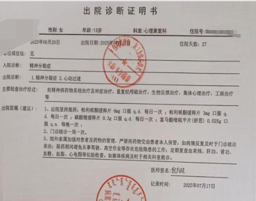 此次群殴给女儿造成了毁灭性的身心伤害:她不仅身体出现应激反应,心理更是遭受重创,经医院诊断,除创伤后应激障碍外,还确诊重度抑郁症、精神分裂症、心动过速,需长期接受抗精神病药物、经颅磁、心理干预等系统治疗,频繁做噩梦、情绪崩溃、极度抵触校园,一提到学校就浑身发抖,原本活泼的女孩彻底陷入心理阴影。