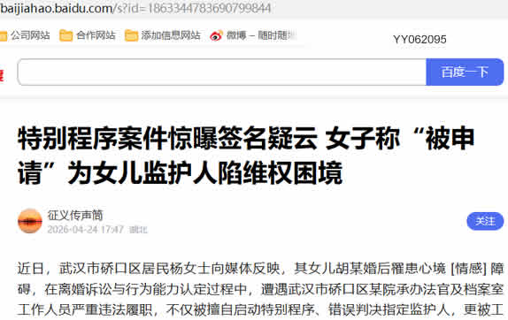 近日,武汉市硚口区居民杨女士向媒体反映,其女儿胡某婚后罹患心境 [情感] 障碍,在离婚诉讼与行为能力认定过程中,遭遇武汉市硚口区某院承办法官及档案室工作人员严重违法履职,不仅被擅自启动特别程序、错误判决指定监护人,更被工作人员以虚假材料栽赃陷害、反咬伪造证据,一位六旬老人为患病女儿奔走维权,却深陷司法不公困境,身心俱疲。